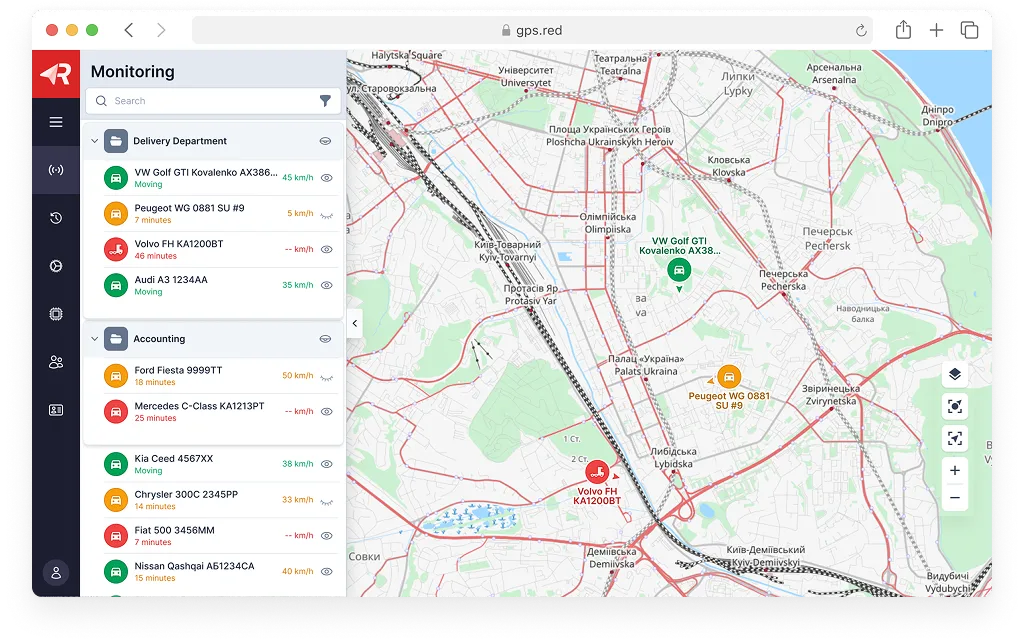 In the GPS.RED web dashboard, you can see current locations, movement history, and route details in a convenient interface.